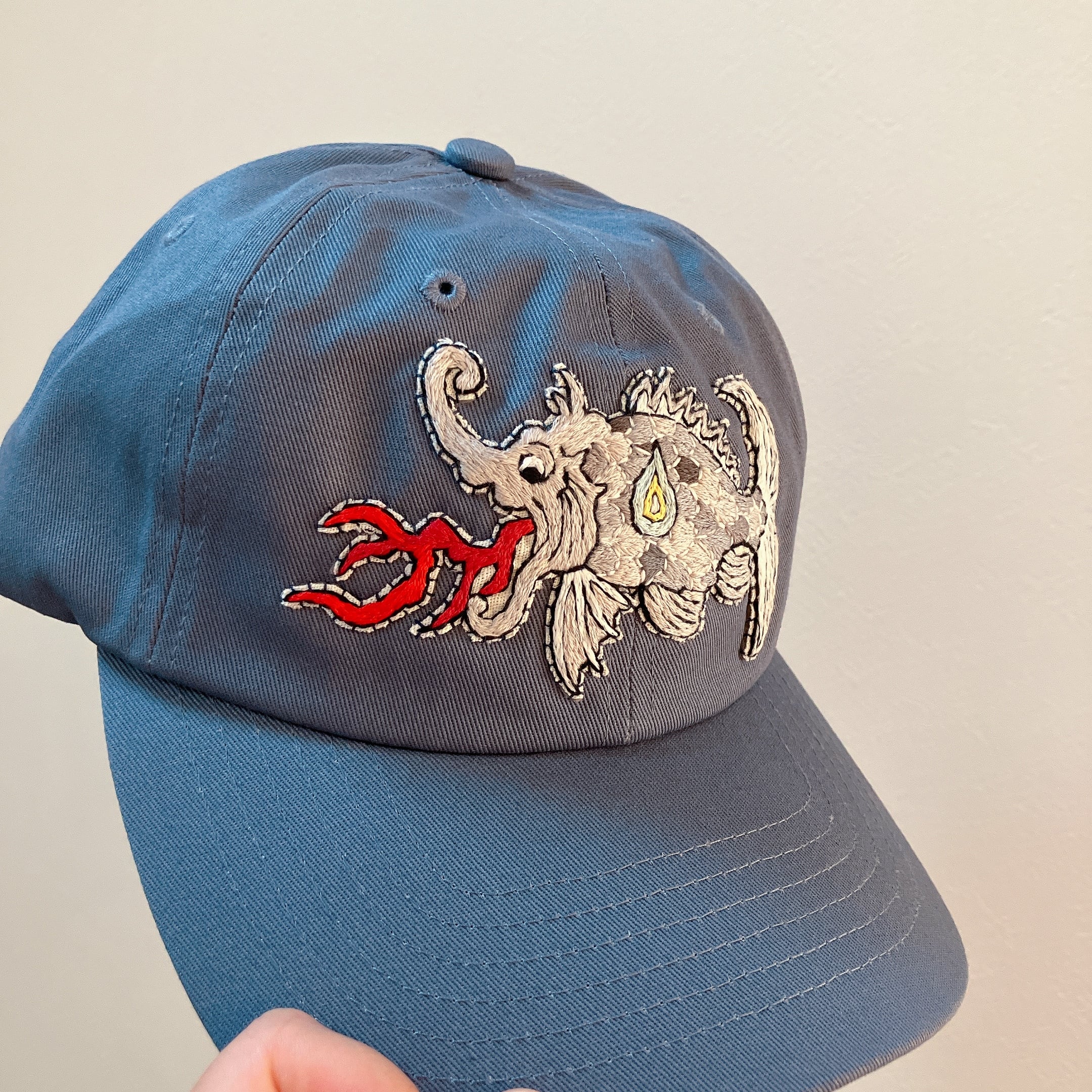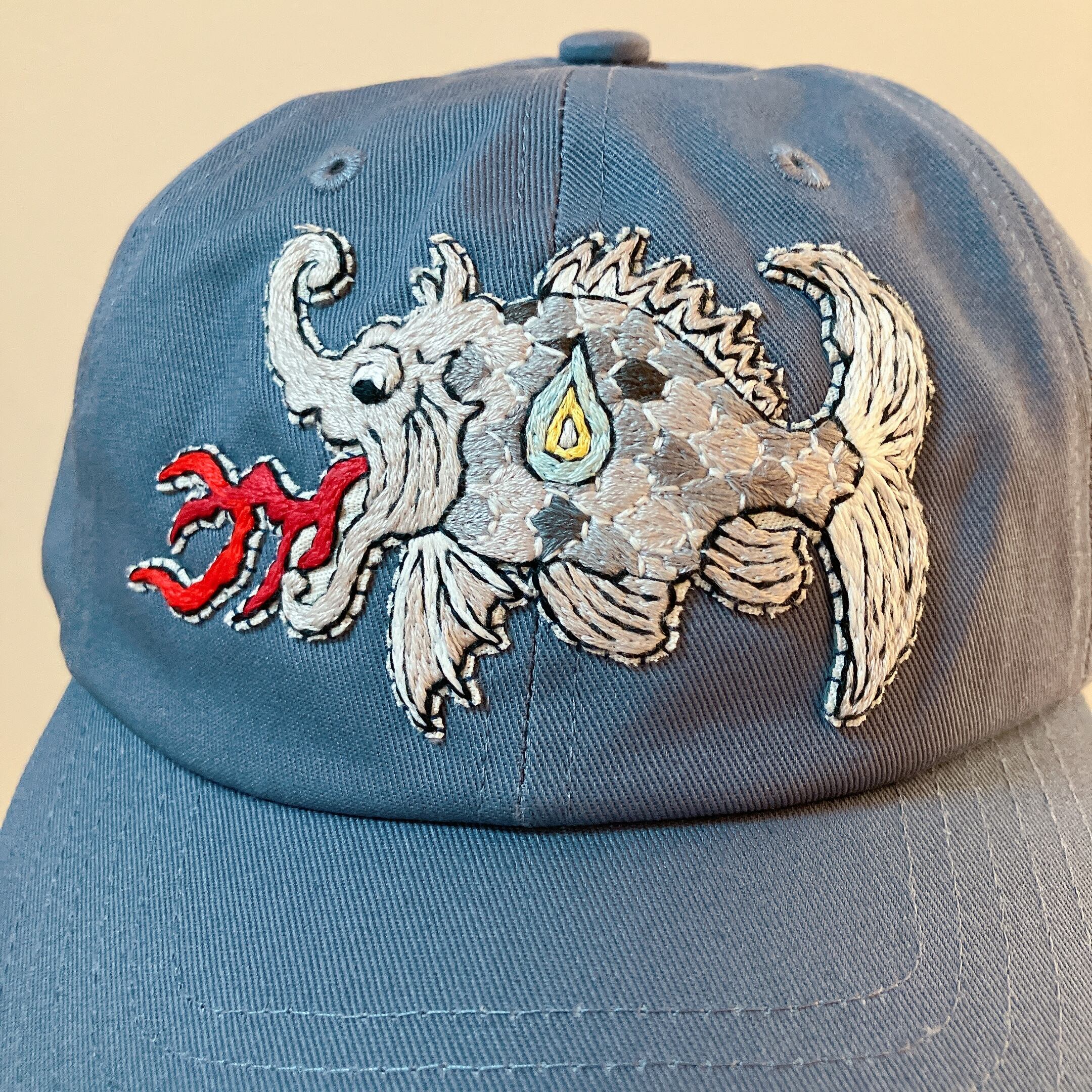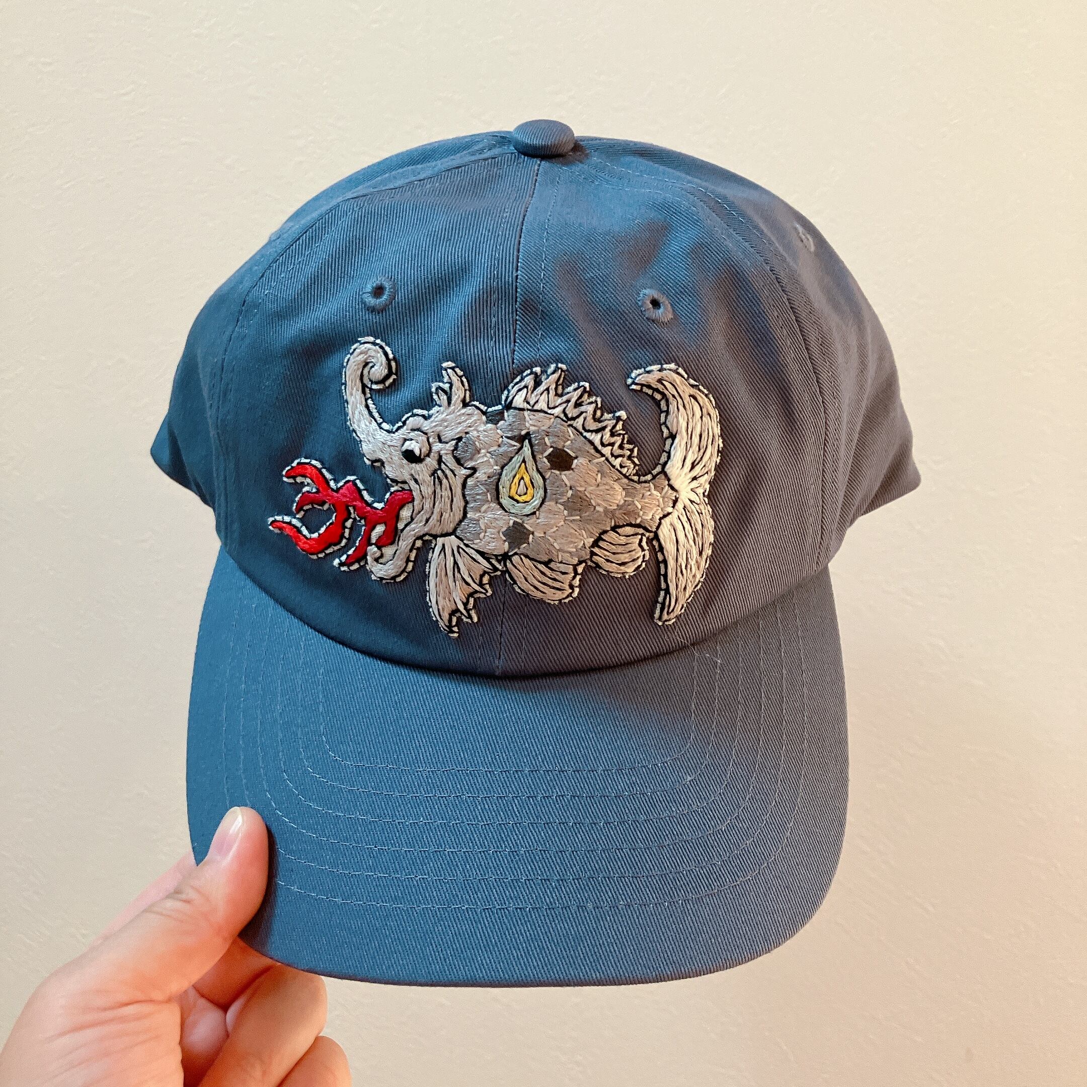妖怪キャップ 手刺繍 付喪神 九十九神 自在鉤の魚 付喪神 妖怪 百鬼夜行 ブルー フリーサイズ 帽子