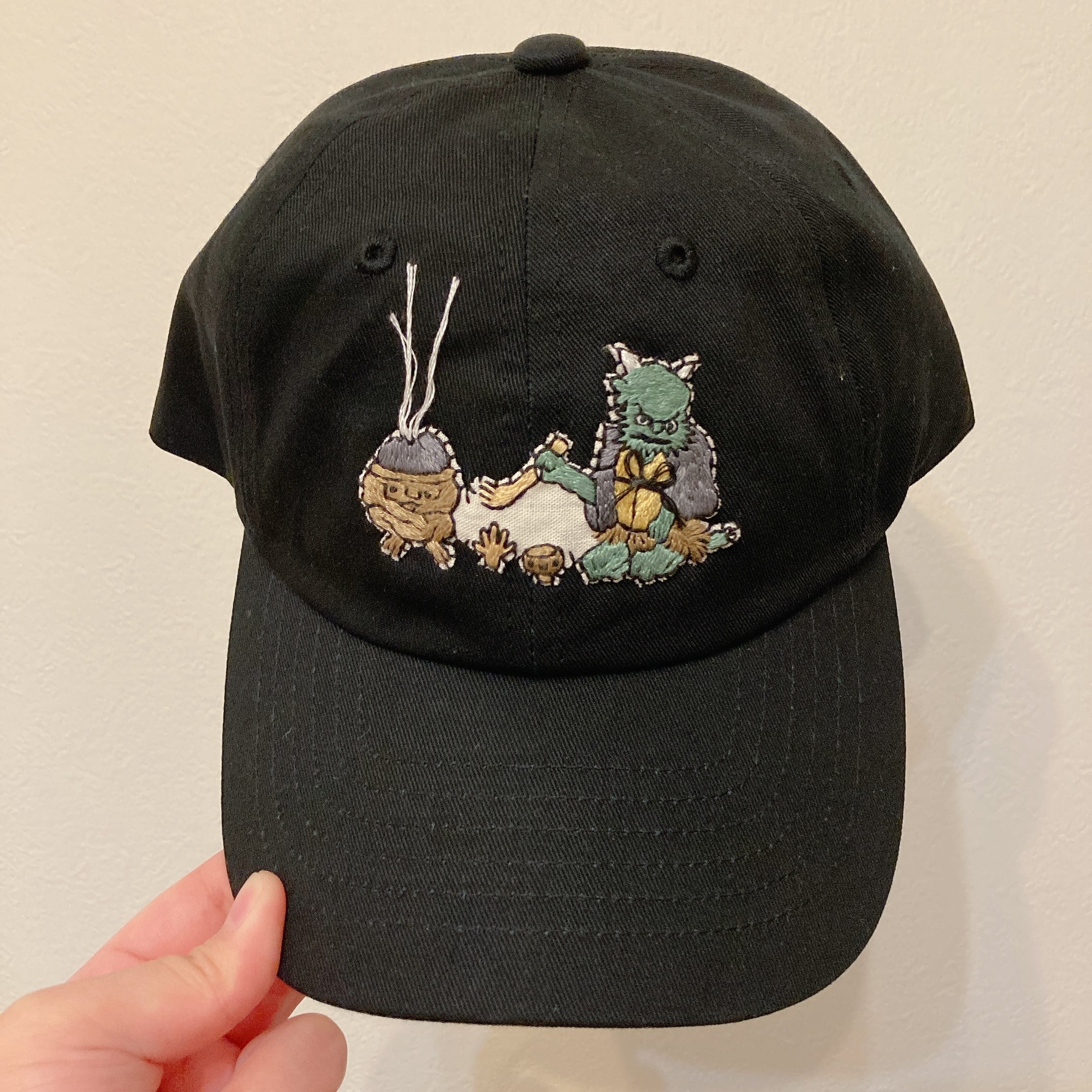 妖怪キャップ 手刺繍 耳鳥斎 地獄絵 茶師の地獄 黒 ブラック もののけ フリーサイズ 帽子